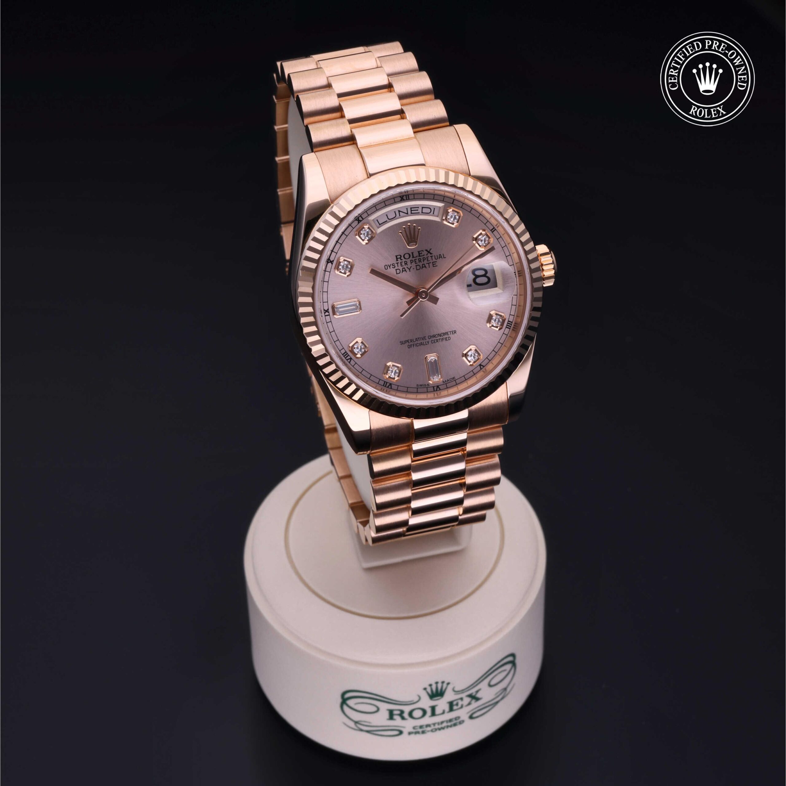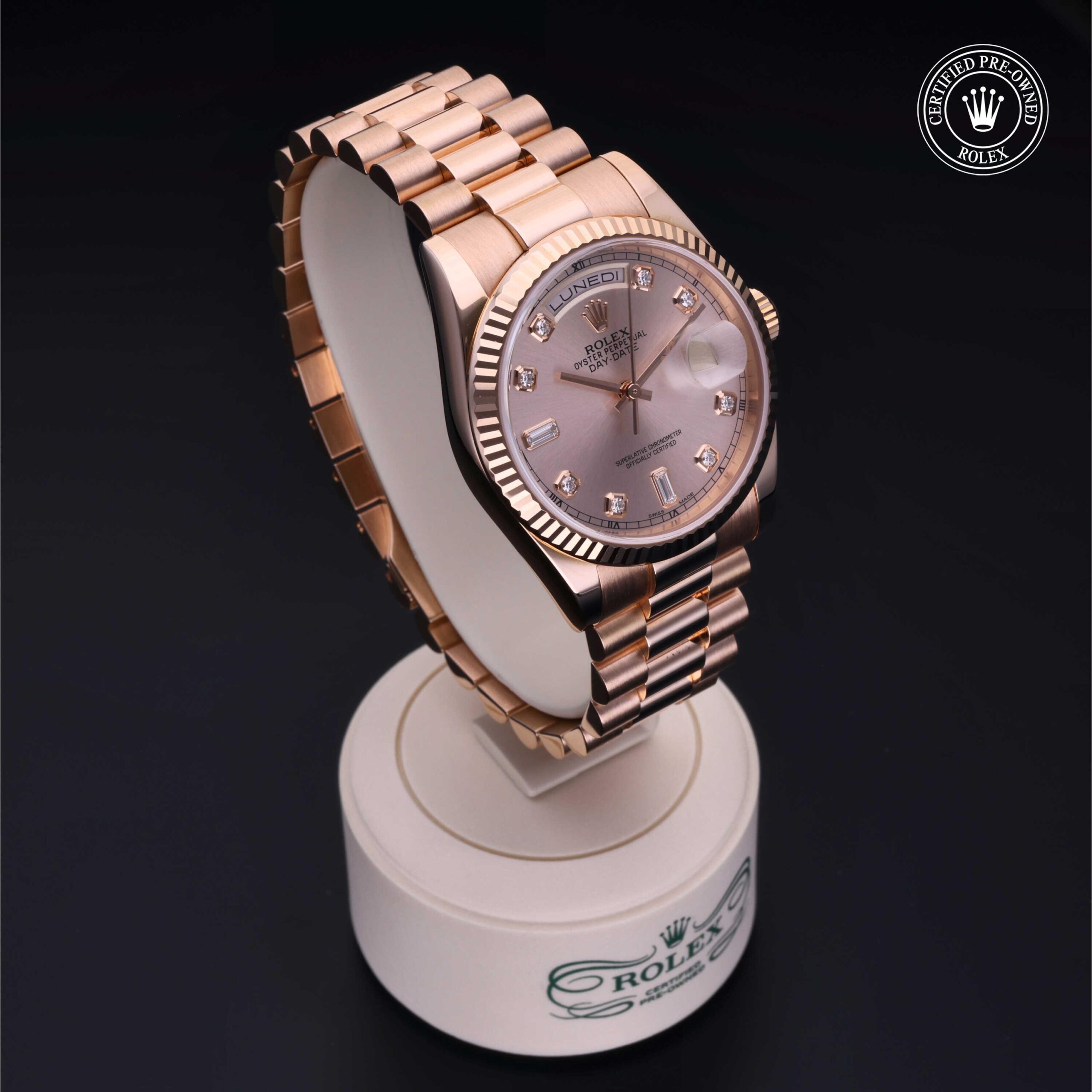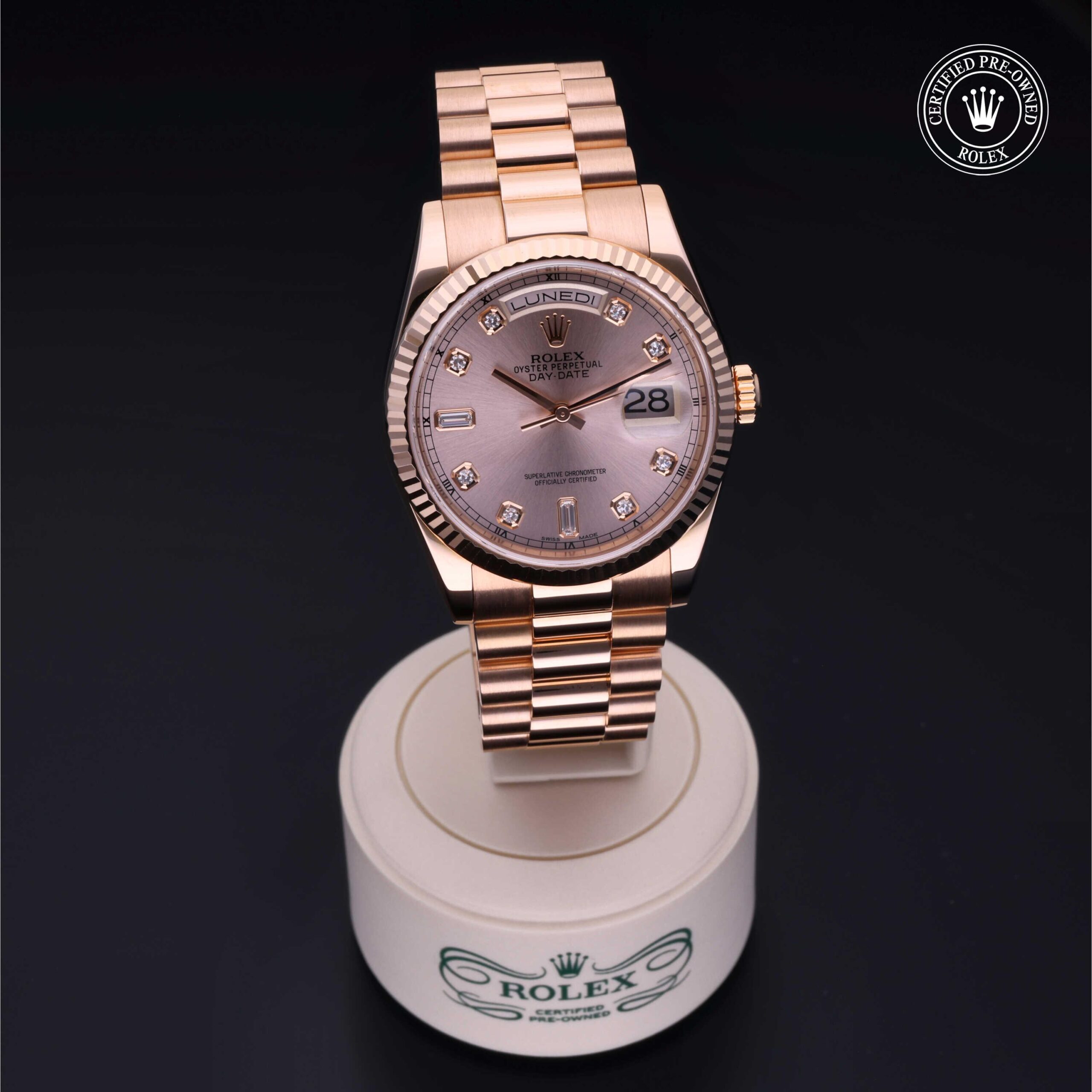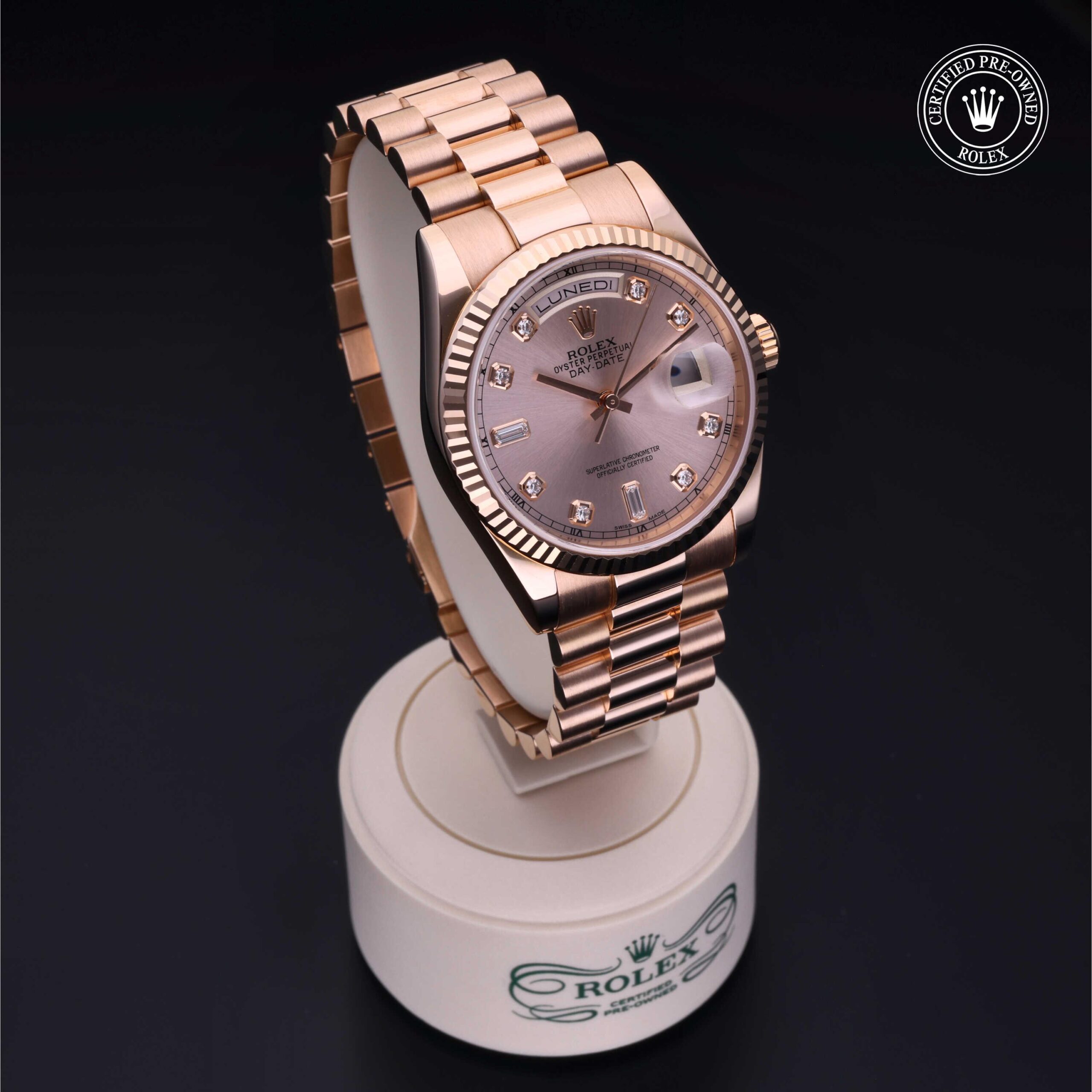 L’Oyster Perpetual Day-Date, disponibile solo in oro 18 ct o in platino 950, incarna la quintessenza del prestigio e dell’eccellenza Rolex. Al momento del suo lancio, nel 1956, rappresenta un’importante innovazione: è il primo orologio da polso al mondo con calendario a indicare, a complemento della data, il giorno della settimana in lettere e per esteso all’interno di una finestrella sul quadrante.